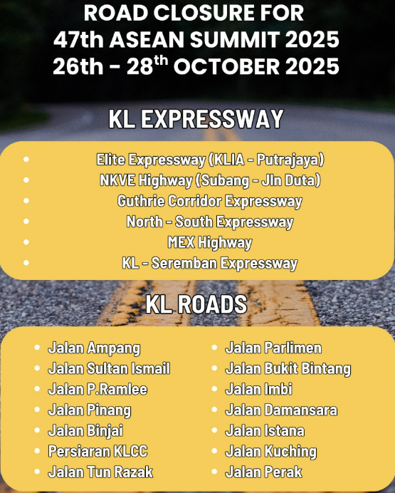 哎呀,吉隆坡要热闹了!第47届东盟峰会10月26到28日在吉隆坡会议中心(KLCC)开锣,全球大咖云集,交通可得“大动干戈”!武吉阿曼交通调查及执法局总监拿督斯里莫哈末尤斯里今天在吉隆坡警察训练中心(Pulapol)喊话:为了让各国元首和代表团顺顺利利跑行程,警方得封6条大道、管制25条主要道路!兄弟姐妹们,开车的得提前规划,不然堵在路上可别怪没提醒哦!