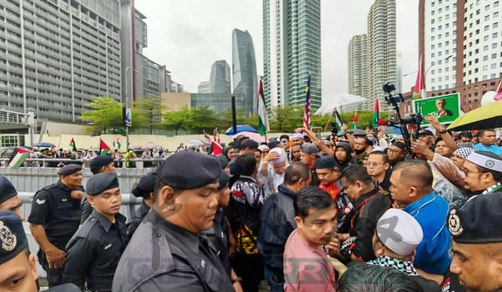吉隆坡10月3日中午,美国驻马大使馆前热闹得像过节!继昨日非政府组织号召民众抗议后,今天逾百名挺巴人士冒着阴雨,聚集大使馆外,高喊要以色列军方释放被扣的23名大马公民!警方和“红头兵”联邦后备队出动上百人,封锁路段严密监控,现场气氛紧张但有序。这阵仗让街坊们直呼:“这抗议规模,堪比大片!”