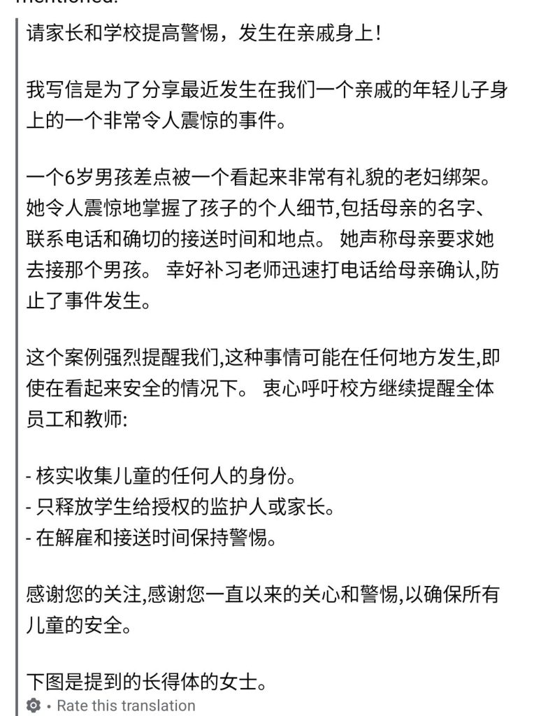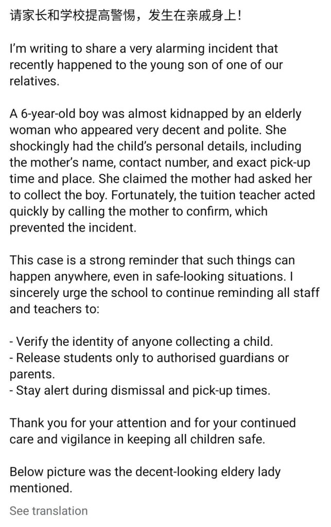 事件在“橙哥与番茄妹”面子书专页疯传,一名家长怒发长文: “这老妇太可怕了!她像认识我们19年一样!” 原来,老妇开着一辆普通轿车,停在补习中心门口,穿得整整齐齐,笑眯眯对老师说:“我是孩子的外婆,妈妈临时有事,让我来接!” 她还一口气报出: